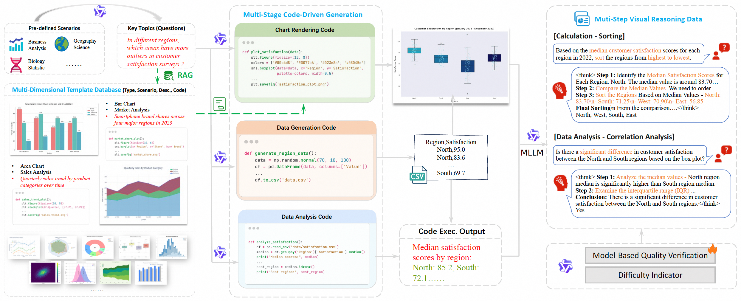 2、长思考链驱动多阶段代码生成:将数据合成分解为“关键问题→数据代码→可视化代码→题目扩充→推理代码与解答”四段式流程,结合长链思维(CoT),提升合成数据的准确性与可解释性。