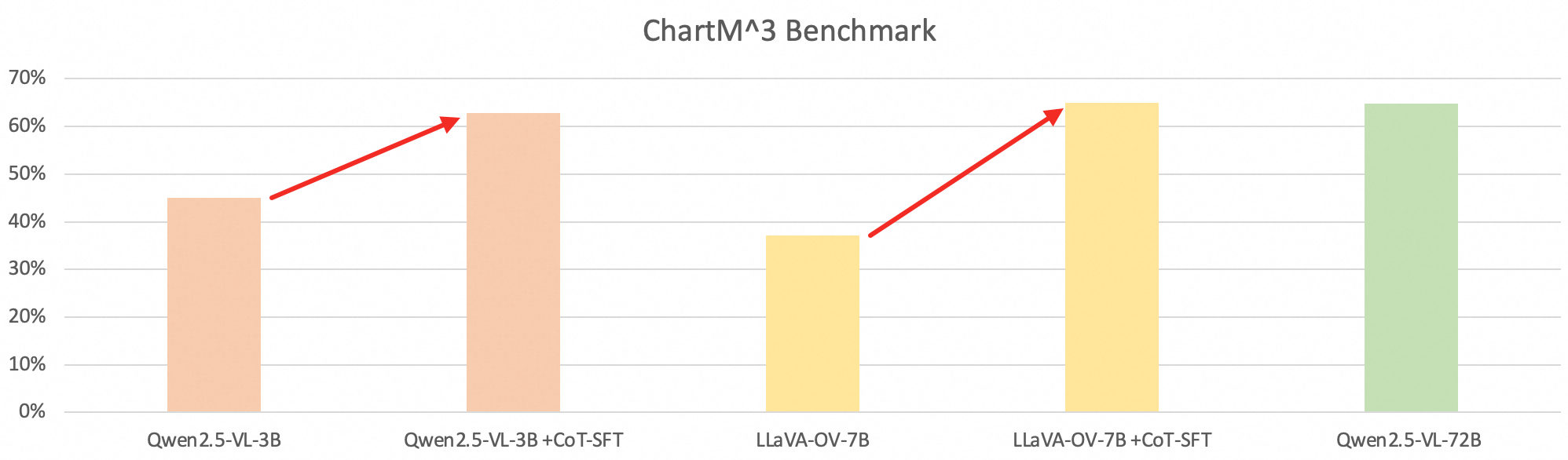 高质量思维链数据的监督微调带来跨越式提升:采用ChartM³构造的CoT数据进行监督微调,在评测集上Qwen2.5-VL-3B和LLaVA-OV-7B分别从45%、37.12%提升至62.88%、64.95%,达到了72B尺寸规模相当的性能,另外实验表明跨域迁移泛化能力。