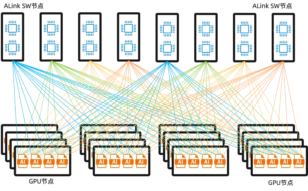 •系统互连采用单级互连架构,采用非以太ALink协议:支持UALink国际开放标准协议,也可支持行业主流GPU芯片的原生内存语义互连协议,如:NVLink、xLink、UB、xCN等。