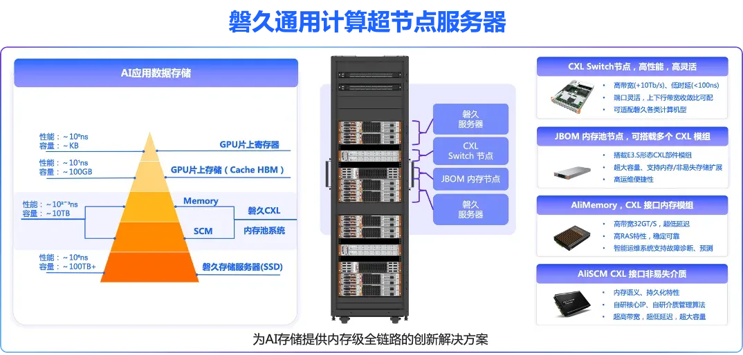 作为超节点服务器,磐久AL128采用面向下一代超大集群的服务架构,重构GPU间互连方式,旨在大模型训练与推理中实现算力与通信协同最优,相对于传统架构,同等AI算力下推理性能还可提升50%。